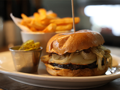Grilled beef burger with Gruyère cheese, lettuce, tomato with sweet caramelized onions and a housemade sauce.
