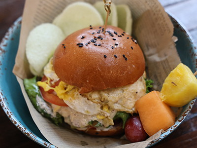 Filipino longaniza sweet pork sausage patty, velveeta cheese, sunny egg, pickled red onions, shishito slaw on an Ube purple yam milk bread bun.