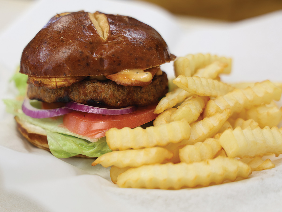 A Beyond patty on pretzel buns with housemade thousand island dressing, vegan mayo, lettuce, tomato, with two smashed plantains on top.
